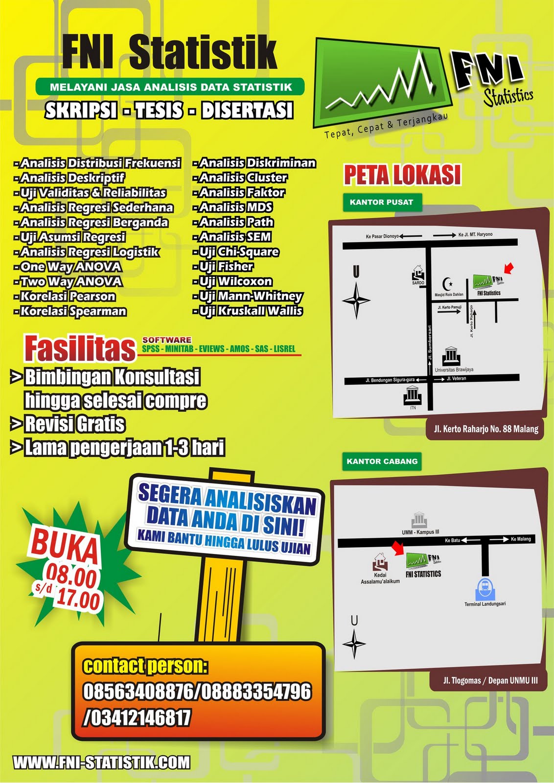 FNI Statistics merupakan lembaga yang bergerak di bidang jasa pengolahan dan analisa data statistik untuk skripsi, tesis, dan disertasi. Kami menawarkan suatu kinerja yang tepat, cepat, dan dengan harga yang bersahabat dimana keseluruhannya mengacu pada satu tujuan utama, yaitu untuk membantu para klien dalam mengolah data penelitiannya. Ditangani oleh beberapa konsultan statistik yang berkompeten, dan telah berpengalaman menangani ratusan klien dari berbagai universitas di dalam negeri, menjadikan kami sebagai lembaga konsultan statistika yang dapat dipercaya.